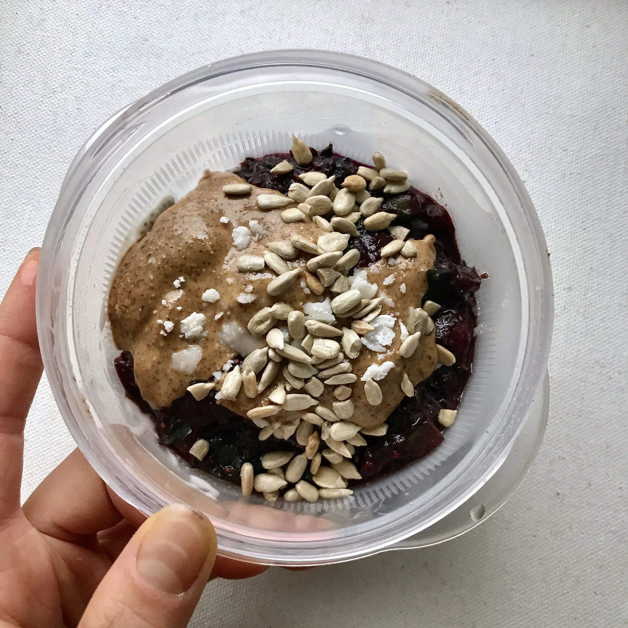 - For the superfood berry compote: Combine berries, frozen kale, and flaxseed meal. Microwave for 1 minute 45 seconds. If you want a sweeter and thicker compote, add a banana before microwaving.