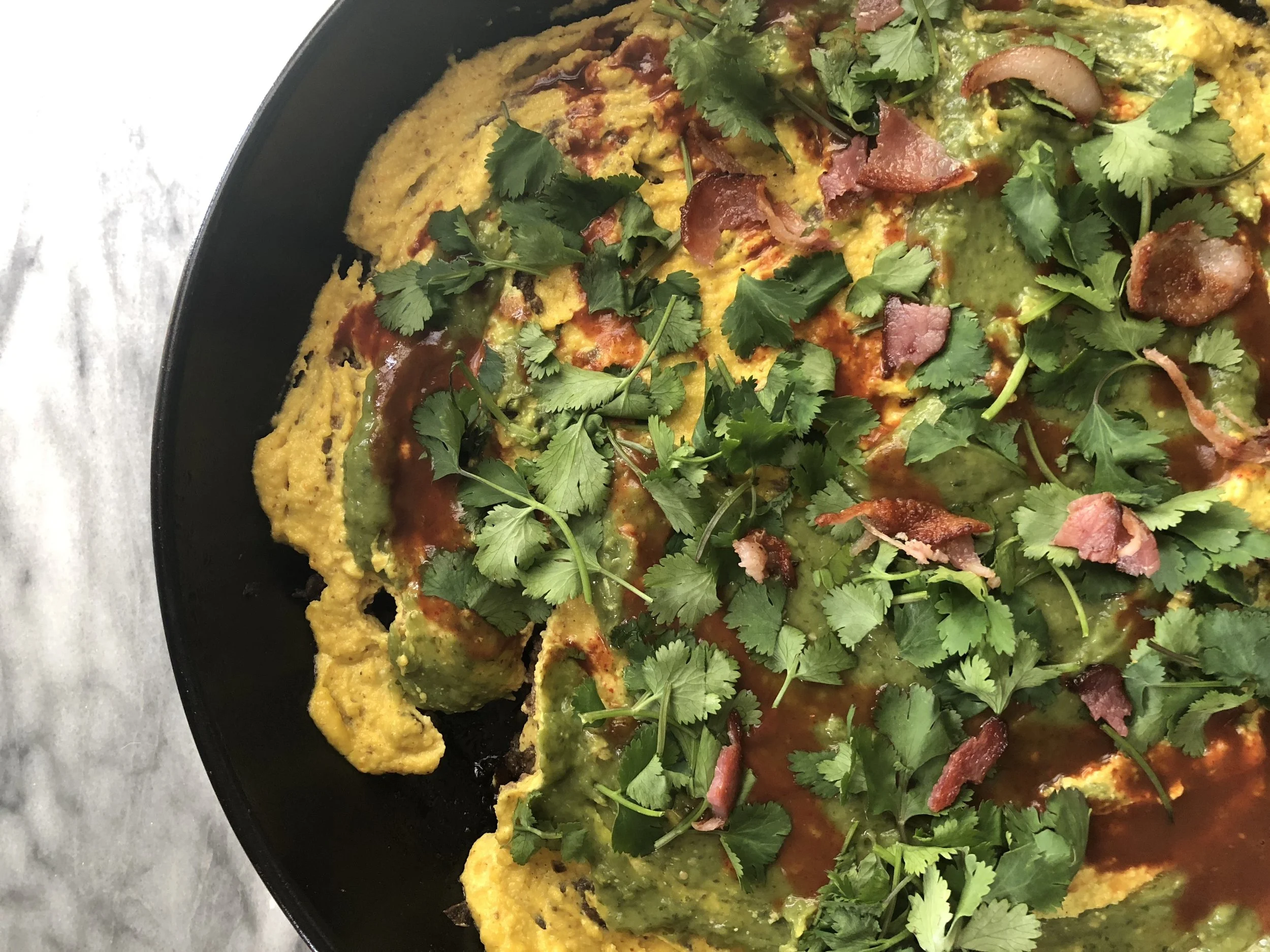 Top with a drizzle of hot sauce, chopped cilantro, and the crumbled bacon.